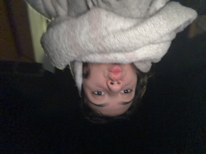 An upside-down selfie shows a person with fair skin, dark eyes, and short brown hair