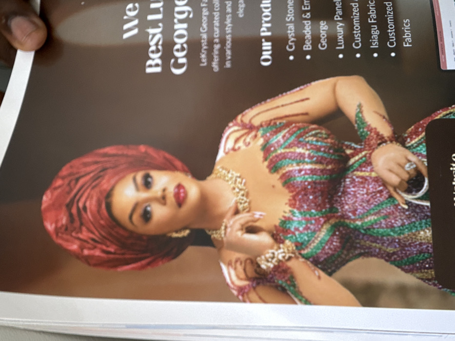 The image is a photograph of a printed advertisement page, held at the upper right by a person's hand. The advertisement features a woman of apparent Nigerian ethnicity, positioned centrally and looking directly forward. She wears an elaborate, deep red traditional Nigerian headwrap ('gele'), full face makeup including red lipstick, and extensive gold-toned jewelry: drop earrings, a multi-layered necklace, a wide bracelet on her left wrist, and a ring on her left ring finger. Her attire is a fitted, formal gown or blouse, richly embellished with green, red/maroon, and gold/bronze sequins or beads in diagonal patterns. The gown has a sweetheart neckline and long sleeves with decorative sheer elements. Her left hand is raised towards her necklace, while her right hand holds a small, metallic, circular object. The advertisement's background is dark brown, featuring white text promoting 'LeKrystal George' and listing products such as 'Crystal Stone,' 'Beaded & Em George,' 'Luxury Panel,' 'Customized A,' 'Isiagu Fabric,' and 'Customized Fabrics.' A partial 'Website' address is visible at the bottom. The scene depicted is a studio portrait for an advertisement and does not show a specific location within a city, including 'Unknown, Nigeria.'