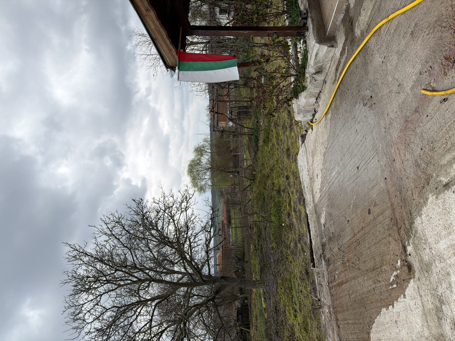 The scene depicts an outdoor residential area in the city of Pchela, Bulgaria, under an overcast sky. In the foreground, a concrete slab, partially wet and stained with visible tire marks, occupies the lower portion of the frame. A bright yellow garden hose lies on this concrete, extending towards a raised porch or veranda structure situated on the right. This structure features a dark wooden roof overhang supported by a vertical wooden pillar, from which a Bulgarian flag (white, green, red vertical stripes) is suspended. A low, rough-hewn stone wall or planter box, holding small potted plants, sits at the base of the porch. Beyond the concrete slab, an unkempt yard extends, characterized by patches of sparse green grass, bare soil, and various leafless deciduous trees and bushes, suggesting late winter or early spring. A large, bare-branched tree stands prominently on the left side of the yard. In the mid-ground, rudimentary fencing is visible, separating sections of the property. The background reveals additional residential structures with red-tiled roofs, interspersed with undeveloped land or fields, and distant rolling hills under the heavy, grey cloud cover. No individuals are present in the image.