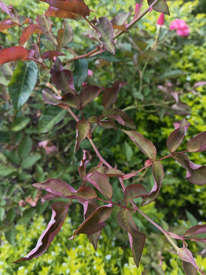 The image displays a close-up, downward-angled view of plant foliage from a rose bush, situated in Thành phố Kon Tum, Vietnam. The foreground is dominated by a branch with numerous leaves exhibiting a diverse coloration ranging from dark green to reddish-brown and pinkish-purple, with pink hues prominent on the edges and undersides of some leaves. The stems are slender, reddish-pink, and feature visible small thorns. The background consists of out-of-focus green and yellow-green foliage, with several indistinct pink rosebuds or small flowers visible towards the upper right, indicative of the plant's species. No individuals, animals, or man-made structures are present within the frame.