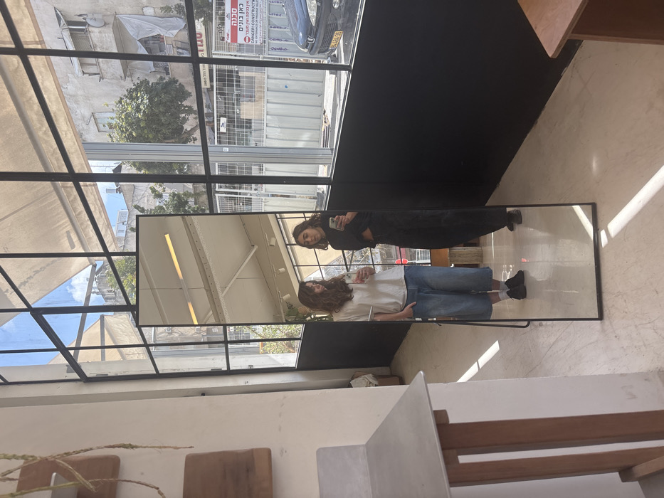 The image depicts two females reflected in a full-length, dark-framed mirror positioned indoors within a commercial establishment in Tel-Aviv, Israel