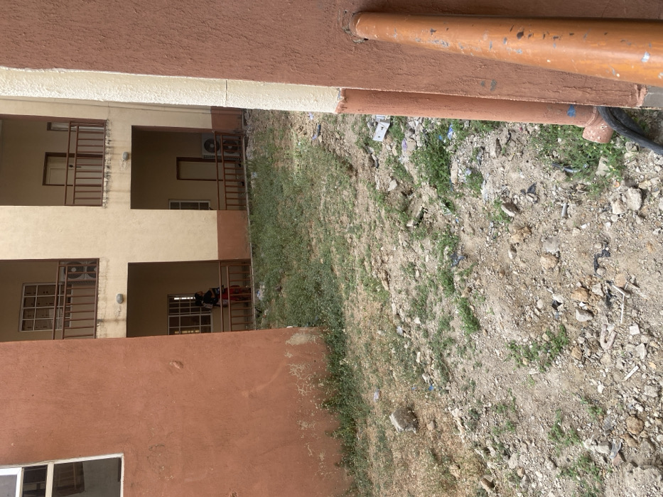The image depicts an outdoor, undeveloped ground area situated between two multi-story buildings in Baganakwo, Nigeria