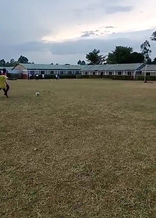 group of young men playing soccer on a grassy field. A long, low, light-colored building sits in the background, possibly a school. The sky is overcast. Some players wear matching red jerseys and some wear yellow jerseys. One player is wearing a green long-sleeved shirt and blue pants. The players are moving and kicking the ball, suggesting they are actively engaged in a game. The grass is dry and brown, and the field appears to be used frequently.