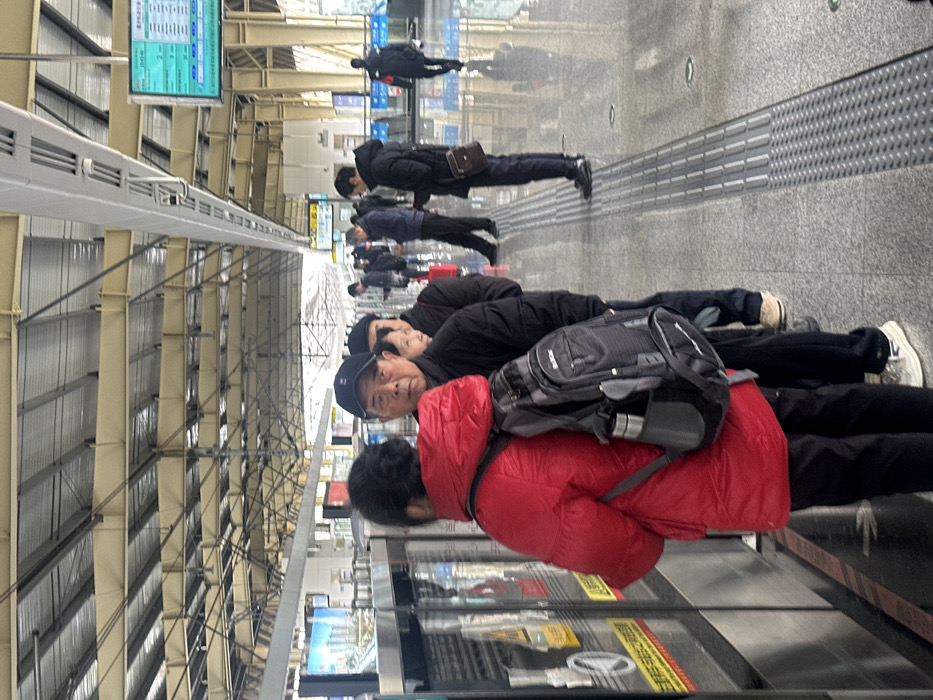 People stand in line at a train station, facing the train doors. An elderly man in a red jacket and black cap is closest to the viewer, wearing a gray backpack. Behind him, others in dark clothing line up. Train information displays are visible overhead. The station has a modern design with metal and gray surfaces.