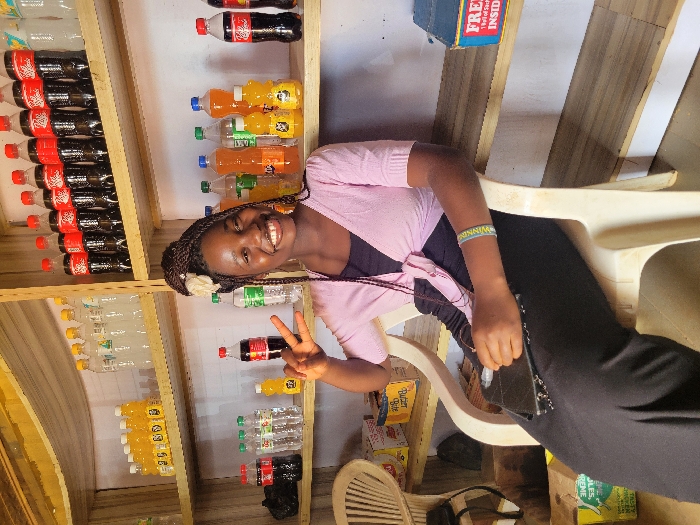 An interior photograph depicts a young Black female seated in a retail establishment in Gura Top, Nigeria. The female, with braided hair styled upwards and secured by a light-colored clip, is positioned centrally, smiling directly at the camera. She wears a black top or dress, a light pink short-sleeved cardigan tied at the waist, and a beaded bracelet on her right wrist. Her right hand is raised, forming a "V" sign, while her left hand holds a dark-colored mobile device and a stylus. She sits on a light-colored plastic chair, with another similar chair partially visible to her left. The background features three wooden shelves mounted against a light-colored wall. The shelves are stocked with various bottled beverages, including multiple Coca-Cola bottles with red labels, clear plastic bottles with yellow and green caps, and orange-colored sodas. The bottom shelf also displays packaged goods in cardboard boxes, one partially visible with the word "Butter" and another with "Free."