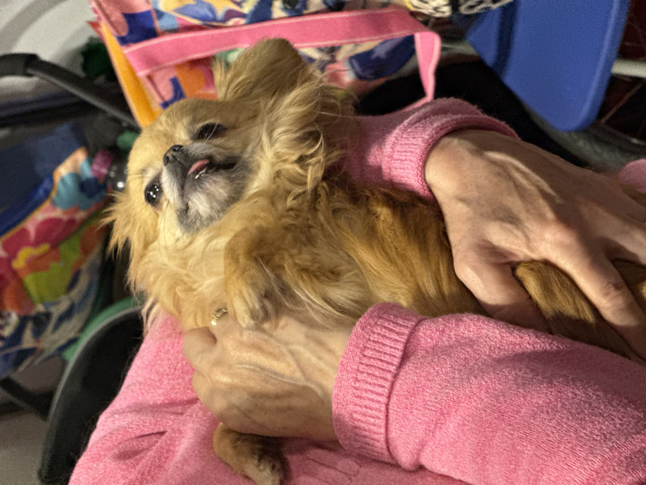 The image presents a close-up, indoor scene within the Metropolitan Borough of Solihull, United Kingdom, focusing on a small, long-haired dog being held by an individual. The dog, appearing to be a Pomeranian or similar breed, has light brown fur and is positioned on its back or side, looking upwards and slightly to its right. Its dark eyes are open, and its tongue is partially extended from its mouth. The individual's forearms and hands, visible in the lower portion of the frame, are supporting the dog. The person is wearing a pink, ribbed, long-sleeved sweater. A gold-toned ring is present on the ring finger of the visible left hand. The background is out of focus, revealing indistinct objects: a multicolored fabric item with pink, blue, and yellow patterns on the upper right, a dark, possibly metallic or plastic structure behind the dog's head, and a partial blue object resembling a stool or chair seat on the lower right. The interaction consists of the person gently holding the dog in a resting position.