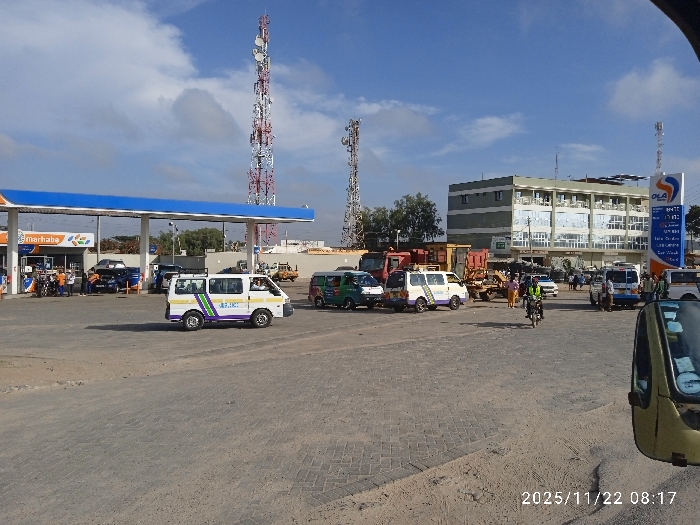 A busy street scene shows multiple vehicles including vans, cars, and trucks near a gas station under a blue awning labeled "marhaba." Several people are visible around the gas station and on the street. Two tall communication towers rise in the background beside a multi-story building. The pavement is light gray and sandy. The date "2025/11/22" and time "08:17" are stamped at the bottom of the image.