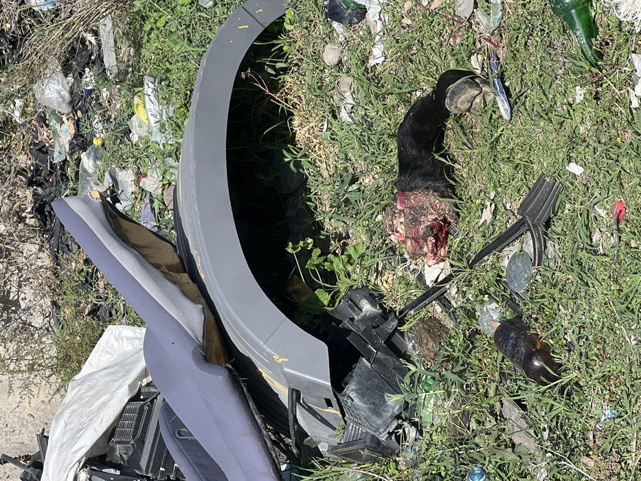 The image displays a cluttered, unkempt outdoor area in Tbilisi, Georgia, characterized by overgrown green grass and various forms of refuse under bright daylight. A prominent subject in the mid-foreground is a severed black ungulate limb, identified by its cloven hoof and dark, short hair. The limb is severed cleanly, exposing raw muscle tissue, bone, and connective tissue. Behind the severed limb, a curved, dark gray vehicle fender or wheel arch is positioned, showing yellow paint marks. Resting against the fender is a blue-grey upholstered car seat back, partially dismantled with exposed foam. To the immediate left of these automotive components, a collection of black plastic parts, possibly from a vehicle's interior or engine bay, is stacked. The ground is extensively littered with miscellaneous debris, including fragments of brown and green glass bottles, various clear plastic bags, plastic sheeting, and unidentified discarded items. In the background, additional refuse and dense, dry vegetation are visible, suggesting an unofficial dumping ground or neglected parcel of land. A light-colored wall or structure is faintly discernible at the top of the frame. No human presence or active events are depicted.