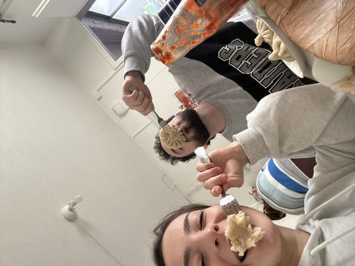The image is captured from a low angle, looking upwards at two individuals engaged in eating in an indoor setting. In the foreground, a female with dark hair, wearing a light grey hooded sweatshirt, smiles with closed eyes, holding a fork with a large, light-colored, amorphous food item positioned towards her open mouth. Partially visible behind her left shoulder is a segment of a blue and white striped garment, possibly belonging to another person or a background item. To the bottom right, a male with dark hair and a beard, wearing a grey and black two-tone sweatshirt featuring "RAIDERS" text, holds a fork with a single, pleated, light-colored dumpling towards his mouth, looking at the camera. On a surface in the lower-left portion of the frame, a brown, woven-patterned object (resembling a basket or bowl) sits next to a white plate containing several more pleated dumplings. A clear plastic bottle filled with reddish-orange sauce is also present on the surface. The background consists of plain white walls and a white ceiling, where a single light fixture with a bulb is visible. No discernible visual markers or identifying features are present within the image to confirm a specific location within Strasbourg, France.