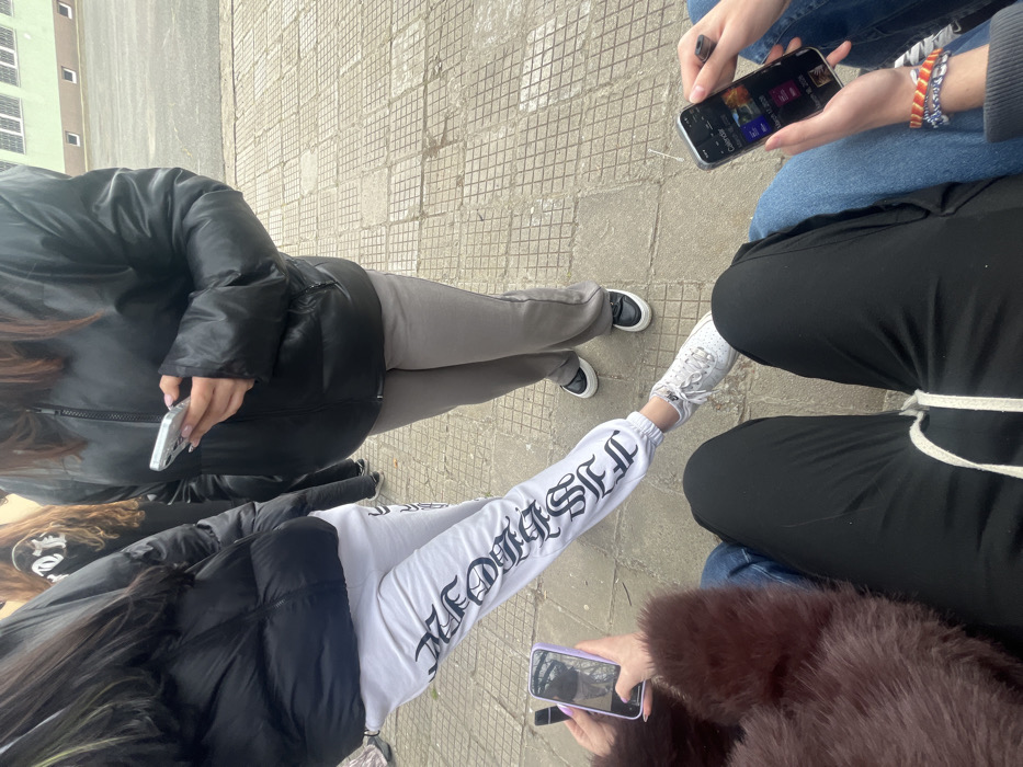 The scene depicts a gathering of at least four individuals outdoors in the city of Yambol, Bulgaria, possibly on a school grounds or public pavement adjacent to a building. The ground is paved with square, light-colored concrete or stone tiles, exhibiting some wear and dirt. In the background, a light green building with multiple rectangular windows, fitted with external metal grates or bars, is visible under an overcast sky. From a raised perspective, the lower bodies and partial torsos of four individuals are prominently featured, with additional indistinct figures visible further in the background. 1. **Subject 1 (standing, center-right):** A female wearing a black puffer jacket and plain grey sweatpants. Her feet are clad in black sneakers with white soles. She holds a silver-cased smartphone in her right hand, held upright with the screen facing away. Her fingernails are painted light pink. 2. **Subject 2 (standing, center-left):** A female, partially visible, wearing a black puffer jacket and light grey sweatpants with black gothic-style lettering running vertically down the outer leg, spelling "FAITHFUL". Her right foot, angled towards the viewer, wears a white Nike Air Force 1 sneaker. 3. **Subject 3 (seated, bottom-left):** An individual wearing dark jeans and a brown faux fur jacket. This individual holds a purple-cased smartphone in their left hand, the screen reflecting a standing figure. 4. **Subject 4 (seated, bottom-right):** An individual wearing blue jeans over black sweatpants with a white drawstring at the waist. This individual holds a black smartphone in their right hand, displaying a calendar application with visible entries for "March 10 2024" and "March 19 2024". A multicoloured beaded bracelet is visible on their left wrist, and a black pen or stylus is held with the right hand. The primary activity observed is the interaction of three of the four prominent individuals with their respective smartphones. No direct physical interactions between the subjects are discernible.