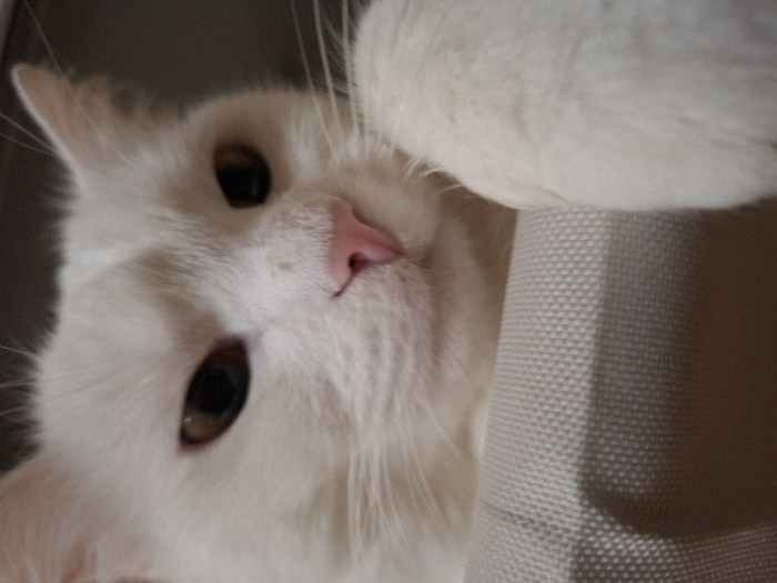 - "A white domestic cat with predominantly white fur, amber-brown eyes, and a pink nose is depicted in a close-up, head-on perspective" by FM-OoACw1, licensed under CC BY 4.0