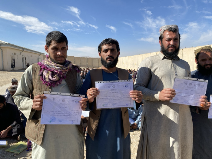 The image depicts an outdoor scene in Mandisar, Afghanistan, under a clear blue sky with sparse clouds. Three adult males of apparent Afghan ethnicity stand in the foreground, facing the viewer. Each man holds a white document in a clear plastic sleeve, presenting it forward. The documents feature Farsi/Dari text, alongside what appear to be official seals or emblems. The man on the left wears a light-colored shalwar kameez, a brown patterned vest, and a multi-colored scarf. The central man wears a dark blue shalwar kameez and a brown vest. The man on the right wears a light grey shalwar kameez and a light-colored traditional cap; he has a prominent dark beard. In the mid-ground and background, numerous other adult males are visible, predominantly seated on the dirt or gravel ground, also appearing to be of Afghan ethnicity and dressed in traditional attire. Some individuals in the background also hold similar documents. Structures in the background include light-colored, low-rise buildings with dark roofs to the left, and a tall, light-colored concrete or blast wall directly behind the subjects. Arid mountainous terrain is visible beyond the wall in the distant background. The ground is unpaved, consistent with dirt or gravel. The scene suggests an organized outdoor gathering or ceremony.