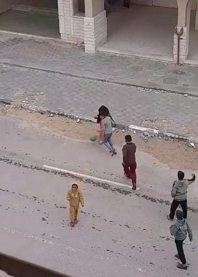 The video captures a scene of children playing soccer on a street near a building. A group of six children are visible, several of whom are actively involved in the game, while others stand nearby or walk along the side. The street is paved with asphalt and shows signs of wear, including cracks and faded markings. The building adjacent to the street is a multi-story structure with archways and a parking area underneath, where vehicles are parked. The video is shot from an elevated perspective, likely from a window or balcony, and a portion of a window frame is visible in the foreground, partially obstructing the view. The overall environment appears to be a residential area, with simple, utilitarian architecture.
