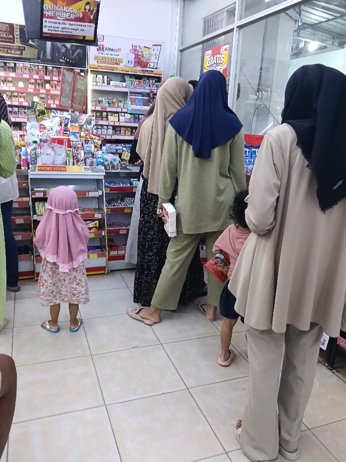 The scene depicts the interior of an Alfamart convenience store in Sumberejo, Indonesia. A group of individuals, primarily women and young children, are present in an aisle. The floor is covered with light-colored square tiles. Merchandise shelves stocked with various products, including snacks, toiletries, and cigarettes, line the walls. Promotional posters for Alfamart and Alfagift, along with "GRATIS" (Free) and "PROMO HEBOH" (Sensational Promo) signs, are visible above and on the shelves. In the foreground, a young child wearing a pink hijab and a floral dress stands with their back to the camera, facing a lower shelf. This child wears blue and white sandals. To their right, several adults are visible. One woman wears a beige hijab and a long black dress with a white floral pattern. Next to her, a woman in a sage green long-sleeved top and matching pants, with a dark blue hijab, holds a white rectangular package. Adjacent to her and partially obscured, a second small child in a pink t-shirt and dark shorts holds a red package. Further right, a woman in a light beige top and pants, with a black hijab, stands facing away from the camera. A glass partition or window is visible on the far right. On the far left, a person wearing a light green top and blue jeans is partially visible. The individuals appear to be browsing or queuing.
