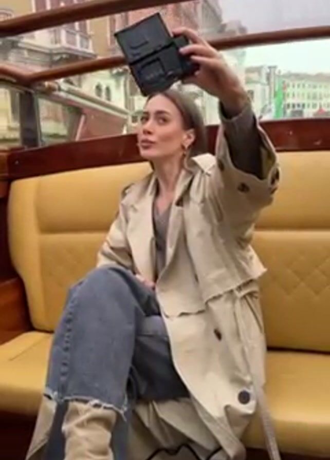 A woman sits in a boat, holding up a small black rectangular object, manipulating it, and taking a photo with it. She is wearing a beige trench coat, jeans, and heeled boots. The boat has a tan leather interior. Outside the boat are buildings, suggesting she is in Venice. The overall lighting suggests an overcast day.