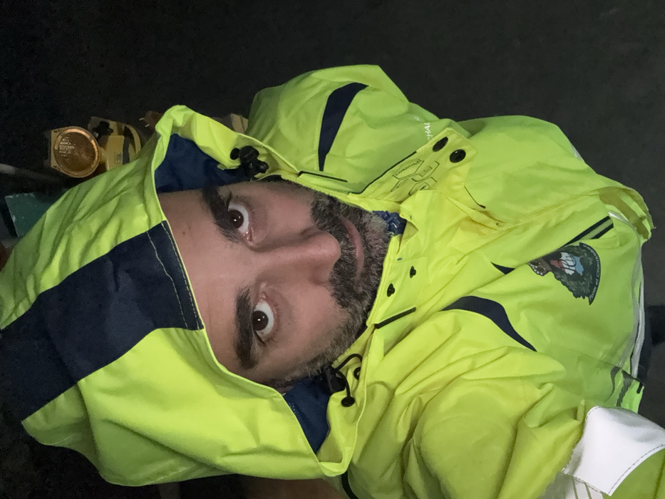 An upward-angled full-frame image depicts a male subject in the city of Grevenmacher, Luxembourg, under dark conditions, possibly nighttime. The subject, a man with a dark beard and dark hair, stares directly into the camera with a neutral expression. He is wearing a fluorescent yellow/lime green jacket with the hood up, featuring navy blue vertical stripes on the hood and navy blue accents on the shoulders/upper arms. A white reflective strip is visible on the outside of his left cuff. On the jacket's left chest, a partially visible emblem resembling a crest or shield is present, with the text "Ponts et Chaussées" clearly discernible. Behind the subject's head, to the upper right, a yellow construction light with a circular orange lens is partially visible. The immediate background and surrounding environment are dark and indistinct.