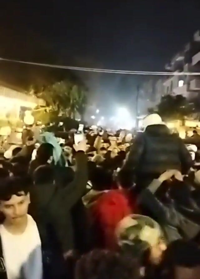 At night, a dense crowd of people is seen celebrating. The focus is on the central figure who is carried on someone's shoulders, wearing a white hat and a dark jacket. Many in the crowd are holding up their phones, likely to capture the moment. The lighting is uneven, with some areas well-lit and others darker, creating a sense of depth. Buildings line the background. The general atmosphere appears festive and lively.