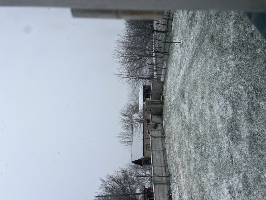 A snowy outdoor scene depicts a yard covered in a thin layer of snow
