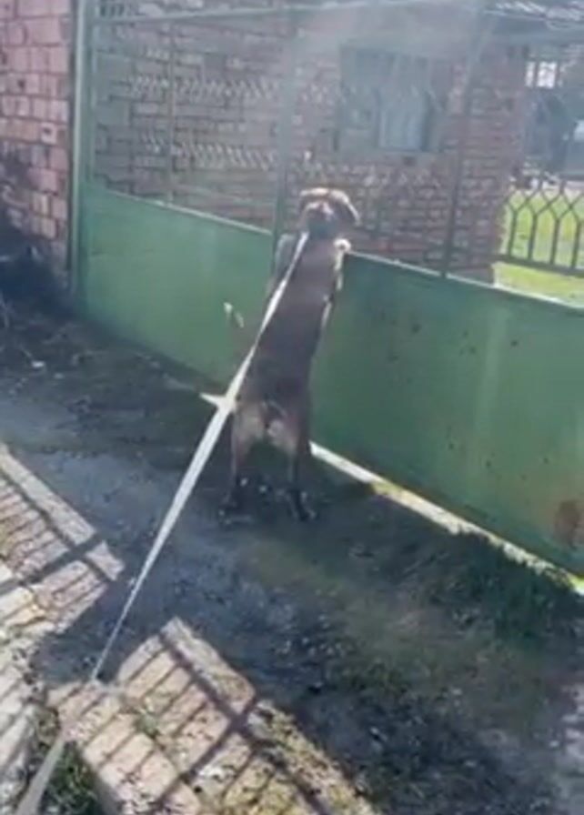 A dog on a leash is standing on its hind legs, with its front paws resting on a green metal gate. The dog is brown and brindle, and appears to be barking. The gate is attached to a brick building. There is a gray gravel path in front of the gate, with some sparse vegetation visible. The sun is shining brightly. The video is shot from a low angle.
