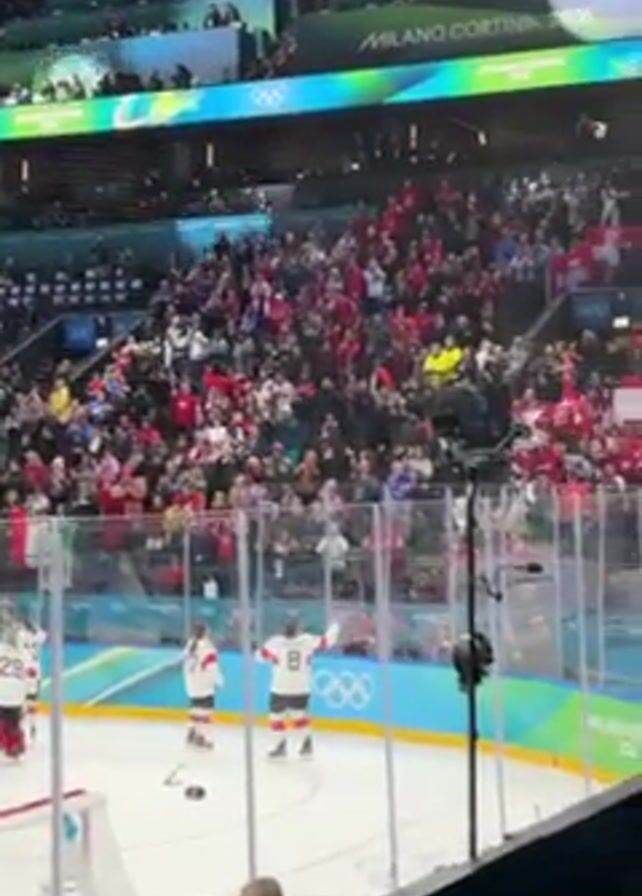 hockey game with a large crowd cheering in the stands. The crowd is mostly dressed in red and waving Swiss flags. On the ice, hockey players in white and red jerseys are visible. A photographer kneels near the rink-side glass, taking pictures. The arena is well-lit with "MILANO CORTINA 2026" displayed overhead. The atmosphere appears celebratory.