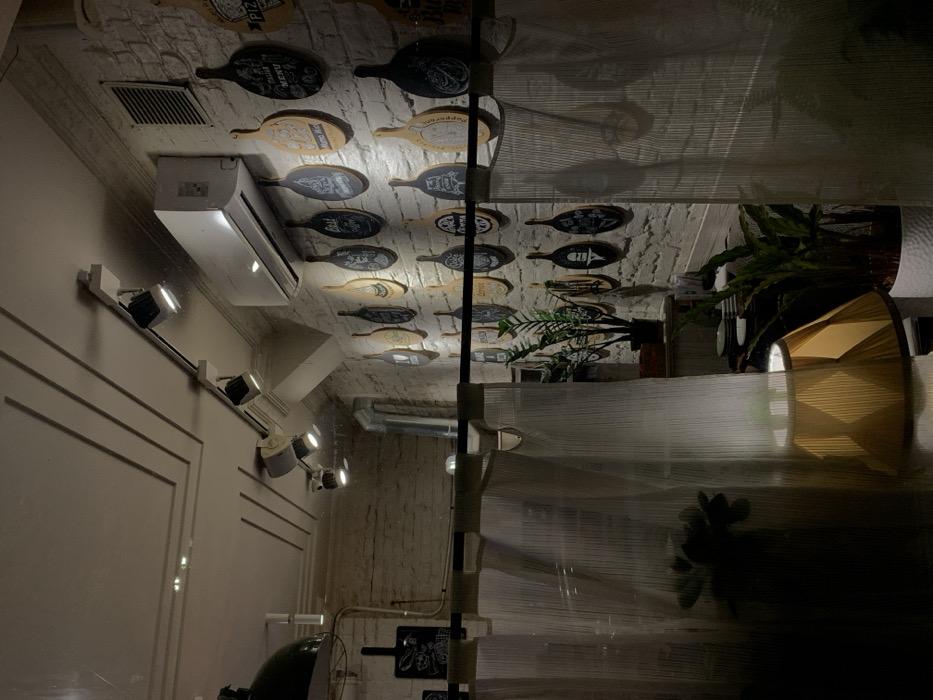The image displays the interior of a commercial establishment, specifically a restaurant or cafe, situated in Odesa, Ukraine. The right wall is constructed of white-painted brick and densely decorated with approximately twenty-five to thirty wooden signs shaped like cutting boards. These signs vary in color (natural wood and black) and feature text and illustrations related to food and local identity, such as "PIZZA MENU," "Best Coffee," "Mama Mia," "I Love Odesa," and "Burger." A white split-system air conditioning unit is mounted high on this wall. The white ceiling exhibits decorative moldings and a track lighting system equipped with multiple directional spotlights providing illumination. Sheer, light-colored curtains on a horizontal rod occupy the mid-ground, partially obscuring the background. Behind the curtains on the right, potted plants and a table lamp with a yellow, geometrically patterned shade are visible. On the left, partially visible behind the curtains, is a dark, bell-shaped pendant light fixture and a rectangular dark sign on a brick wall. No individuals are present, and no actions or interactions are depicted within the static scene. The lighting is artificial and dim.