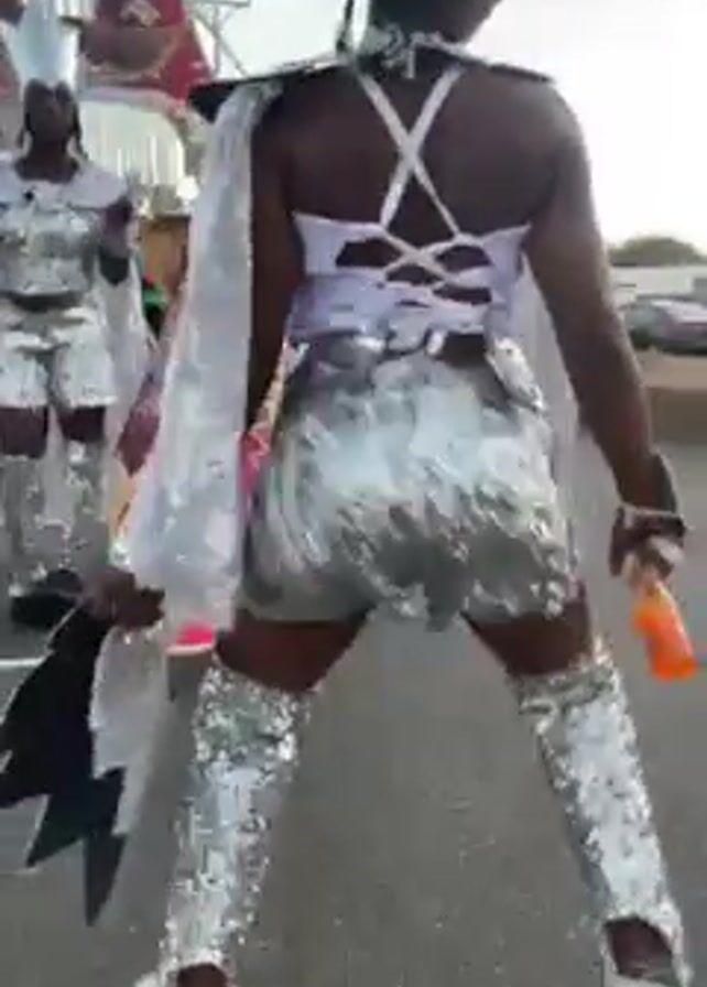 person dressed in a shiny silver outfit, dancing on a street. The outfit includes silver shorts, knee-high boots, a white top with a crisscross back, and a cape. They are holding an orange bottle in one hand. Behind them, other people in similar costumes are carrying a large, decorative fish prop. The sky is visible in the background. The overall atmosphere suggests a parade or festival.