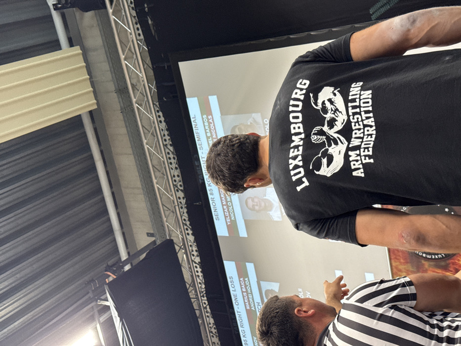 Two men are viewed from behind, one wearing a black shirt with "LUXEMBOURG ARM WRESTLING FEDERATION" printed on the back