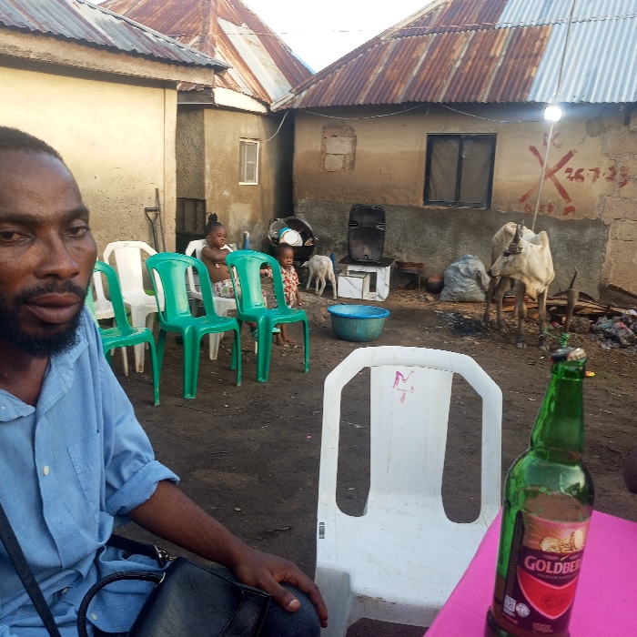 This image depicts an outdoor residential area in Iddo Tudunwada, Nigeria. In the left foreground, a dark-skinned adult male with a beard and mustache is visible from the chest up, wearing a light blue collared shirt and a black shoulder bag. He has a neutral expression and looks towards the right of the frame. An open green glass bottle of Goldberg Lager beer rests on a pink-surfaced table in the lower right foreground, adjacent to a white plastic chair facing away from the viewer. In the mid-ground, five plastic chairs are arranged: three green and two white. Two children are present; one child, wearing a patterned top, is seated on a green chair, and another child, in a patterned shirt, stands nearby. A small, light-colored goat or sheep is visible to the right of the children. The background consists of several single-story buildings with corrugated metal roofs and textured, possibly mud or plastered, walls. One building features a small, light-colored rectangular window, while another has a larger, dark-paned window. A bright white LED light fixture is mounted on the wall of the central background building. Red markings, including an 'X' and the numbers '2673', are present on one wall. Further to the right, a larger, light-colored bovid (likely a cow or large goat) stands. The unpaved ground is dirt, with various items scattered, including a blue plastic basin, a black speaker unit, a shovel, a grey sack, and general debris.