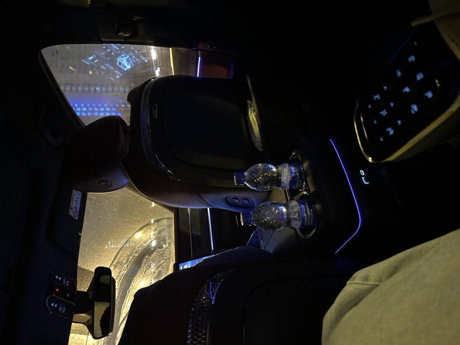Inside a car at night, two water bottles rest in a console. Interior features include a digital control panel, ambient blue lighting, and a rearview mirror. A window reveals blurred city lights outside. The car's interior is dark, with highlights on the water bottles and illuminated buttons.