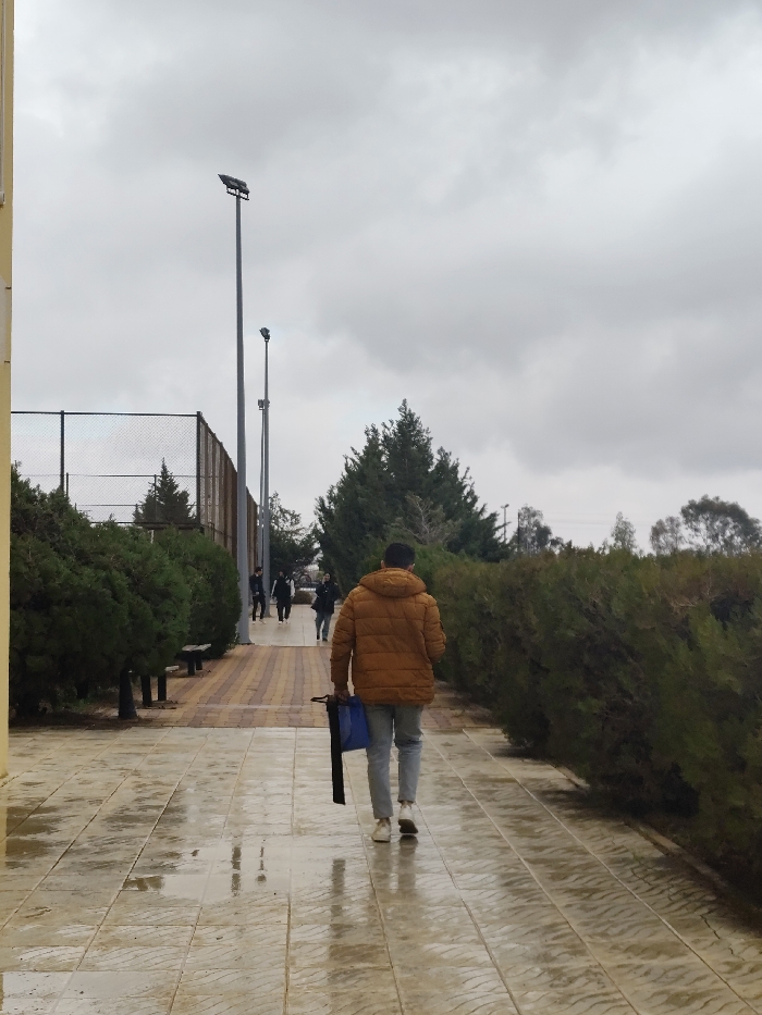 The image depicts an outdoor paved pathway in Jibb as-Safa, Syria, under an overcast sky. The pathway in the foreground is wet and reflective, consisting of light-colored rectangular tiles. Further down the path, the paving transitions to a pattern of reddish-brown and tan rectangular tiles. In the immediate foreground, facing away from the viewer, a male subject walks along the path. He is wearing a mustard-yellow or light brown hooded puffer jacket, light blue jeans, and white sneakers. He carries a blue bag and a black, elongated object in his left hand. To the left of the pathway, a row of dense, rounded evergreen bushes lines the path, with two dark benches partially visible among them. Behind these bushes, a tall chain-link fence is visible, extending into the mid-ground. Beyond the fence and bushes, several conical evergreen trees are present, with additional, denser clusters of evergreen trees in the background. A light-colored building edge is visible on the far left. To the right of the pathway, a long, sloped hedge of evergreen bushes runs parallel to the path. Further into the background on the right, additional trees are visible. In the mid-ground, two tall, grey light poles with overhead fixtures rise above the vegetation. Approximately four to five additional individuals are visible walking on the path ahead of the foreground subject, moving in the same direction. These individuals are dressed in dark clothing, with one appearing to wear a dark jacket and white pants, and another a dark top and light blue jeans. No specific interactions between subjects are discernible.
