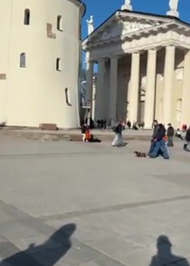 public square with a tall, light-colored tower on the left and a large building with columns and statues on the right. Several people are walking around the square, and a woman is playing a cello on a stone platform near the tower. A small brown dachshund on a leash is walking with a couple in the foreground, moving from right to left in the frame. Shadows of the person recording the video are visible in the foreground. The sky is clear and blue.