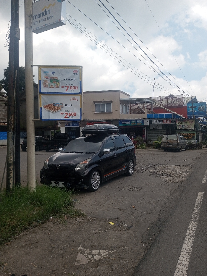 The image displays a street scene with a black minivan-style vehicle, likely a Toyota Avanza or Daihatsu Xenia, parked on an unpaved shoulder adjacent to a deteriorating asphalt road. The vehicle is equipped with a black roof cargo box, chrome side mirror caps, and aftermarket multi-spoke silver wheels. An orange and black stripe decal is present on its lower side, and the front license plate reads "F 1040 LO". To the left of the vehicle, a utility pole supports a blue and white "mandiri atm setor tarik" sign, below which two yellow-bordered banners are displayed. The upper banner advertises "MR.BREAD" at "RP 7.000 /pcs", and the lower banner shows "TELUR" (eggs) at "RP 2.600 /butir". A small patch of sparse grass and weeds grows on the unpaved ground by the pole. The asphalt road surface exhibits extensive cracking and numerous potholes, particularly where it meets the unpaved shoulder. A solid white line is visible on the right side of the paved roadway. In the background, a dark-colored pickup truck is partially visible behind the black minivan, and further down the street, two older, light-colored vans are parked. A row of commercial buildings lines the street, including a two-story structure with a light brown/beige facade and two upper-story windows. Various other commercial signs are visible, with a partially obscured "NIPPON PAINT" sign appearing on the far right. Multiple overhead electrical or communication wires traverse the frame against a sky that is partly cloudy. A small, light-colored dome structure is faintly visible in the far left background. Based on the visible signage (currency "RP", "mandiri", and product names) and the license plate format, the scene is located in Indonesia, not Kalchini, India.