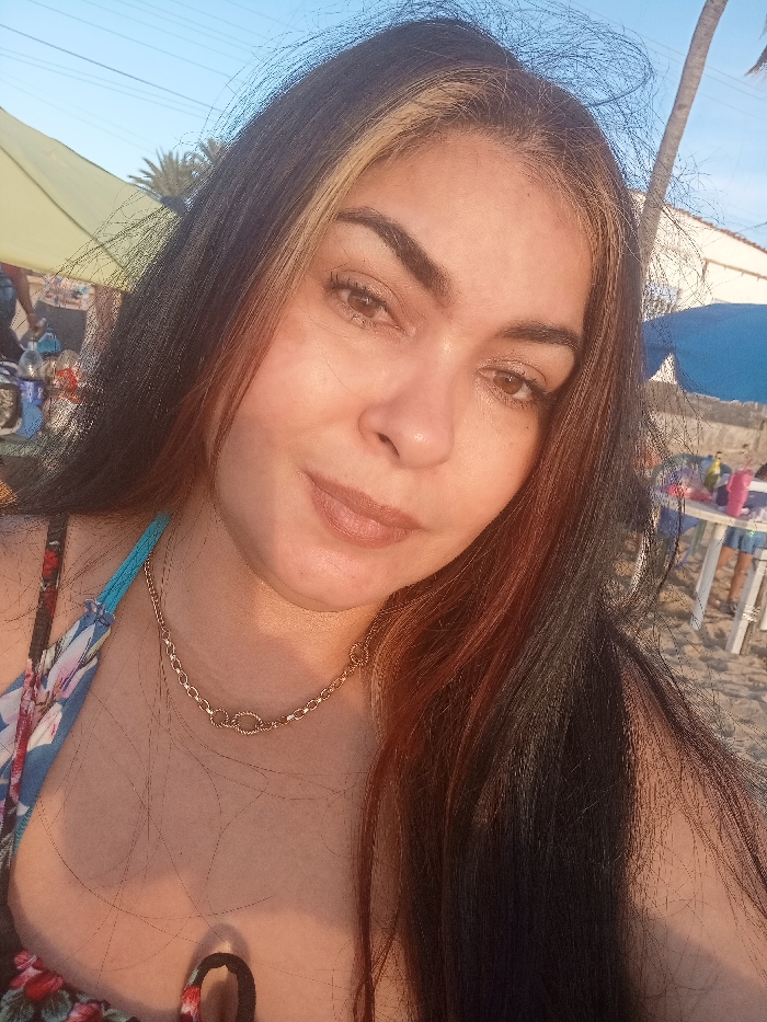 A woman poses for a selfie on a beach. Her long, dark hair is highlighted with blonde streaks. She wears a gold chain necklace and a patterned top with blue straps. In the background, beach umbrellas, tables, and other beachgoers are visible. The scene is bathed in sunlight, suggesting a bright, warm day.