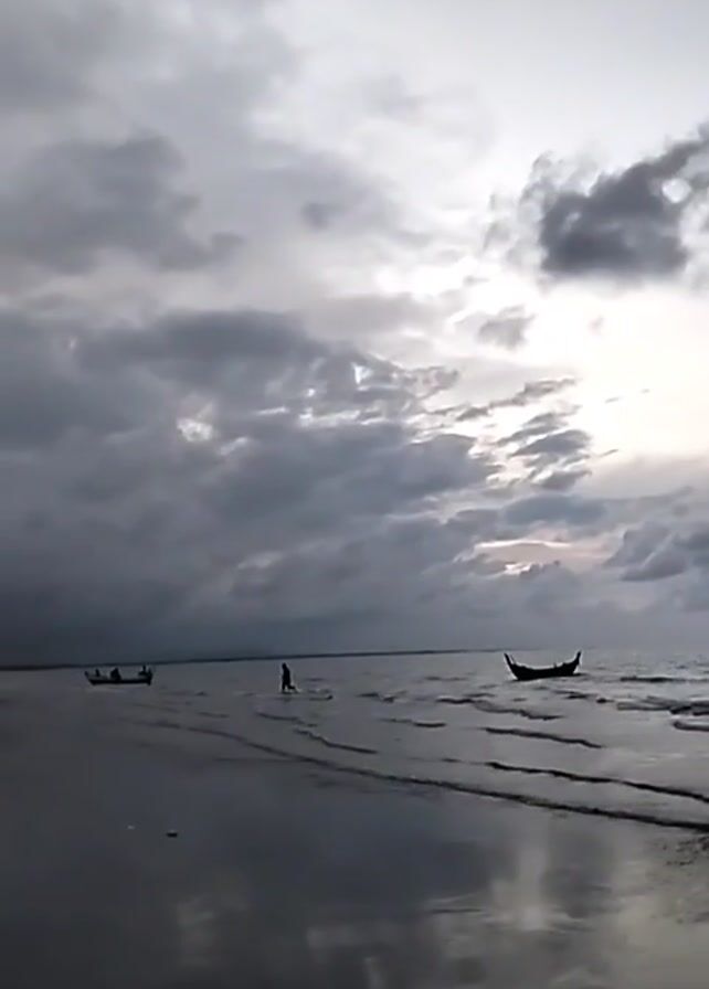 dark sandy beach with a flat ocean under a cloudy sky. There are three small boats in the water. The boat to the right is empty and still. The middle boat has several people in it, and a person walks toward it from the shore. In the far left there is also a person walking in the water. The ocean surface is slick and reflective.
