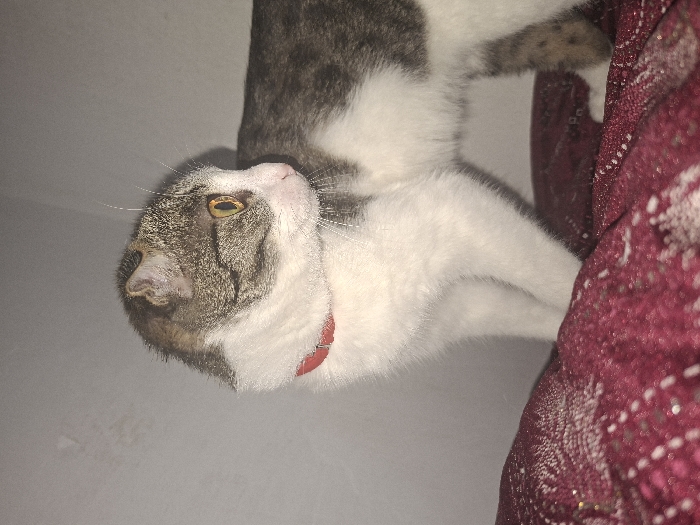 - "A domestic cat, exhibiting white fur on its chest, front legs, and underbelly, and brownish-grey tabby markings on its back and head, stands on a dark red textured fabric" by FM-OxQk33, licensed under CC BY 4.0