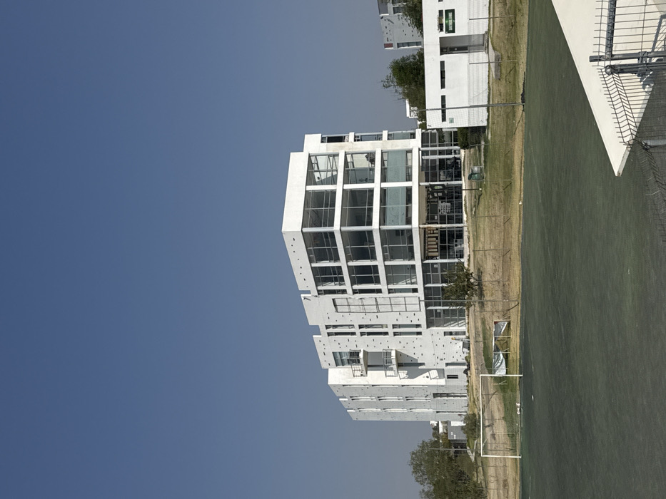 The image depicts a modern, multi-story white building under a clear blue sky in La Venta, Mexico. The building features extensive glass facades, particularly on its right side, with large, dark-paned rectangular windows arranged in a grid pattern across multiple floors. The left side exhibits white walls with smaller, irregularly spaced windows and two visible balconies with white railings. Dark circular markings are present on some white wall sections. In the foreground, a green artificial turf sports field occupies the lower left, complete with a white soccer goal and net. A white banner or tarp is visible behind the goal. The field is bordered by a dry, brown grassy area and a dark-colored fence. To the right of the sports field, closer to the main building, is a smaller, white rectangular structure with green signage and an entrance. Sparse trees and shrubs are scattered throughout the scene, primarily in the midground and background. No individuals are visible. In the immediate foreground, a partial white triangular structure and a metal fence are present on the lower right, indicating the vantage point.