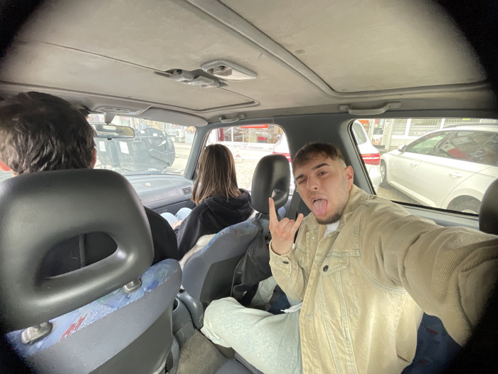 The scene depicts the interior of a vehicle, looking forward from the backseat towards the front occupants and the exterior environment. Three individuals are present. In the right rear passenger seat, a young male with light brown hair and stubble is capturing a selfie. He wears a light beige corduroy jacket over a white top and light grey sweatpants. His right hand is raised, forming a "rock on" gesture, while his tongue is extended, and his left eye is partially closed or winking. In the front driver's seat, a male individual with dark, curly hair is visible from the back of his head and shoulders, wearing a dark top. In the front passenger seat, a female individual with long, straight dark hair is visible from the back, wearing a black hooded top and blue jeans. Both front occupants are facing forward. The vehicle's interior features a light grey fabric headliner with a visible sunroof mechanism. The front seat headrests are black, and the front passenger seat shows a distinctive blue and white patterned fabric on its lower backrest. Outside the vehicle, the setting is an urban environment in Plovdiv, Bulgaria. Through the right-side window, a petrol station is visible, including white fuel pumps with red accents and a white modern sedan (resembling a Skoda) parked nearby. Through the front windshield, the rear of a dark-colored utility vehicle, possibly a garbage truck, is prominent. Other blurry vehicles and commercial buildings with unidentifiable red signage are in the background. The lighting suggests daylight conditions, possibly overcast. The precise street or district within Plovdiv cannot be determined from the available visual information.