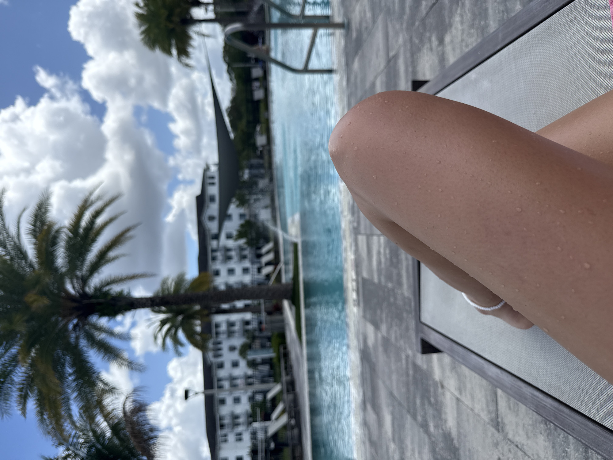 A close-up shot taken in what appears to be Naples, Florida, depicts a person relaxing on a lounge chair beside a pool. The foreground features a tanned leg with droplets of water, resting on a grey mesh lounge chair. An anklet is visible around the ankle. The background reveals a swimming pool with a grey deck. Beyond the pool, palm trees sway in the breeze. A large, modern white building with a dark spire stands in the distance. The sky is blue with scattered white clouds.