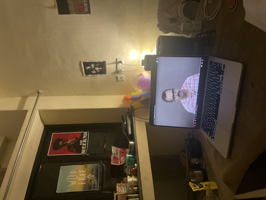 laptop computer on a table in an apartment in Jaipur, India (26.863, 75.821). The laptop is open, displaying a video of a man with a red plaid shirt. The video is playing on YouTube, and the video title, "Lal T 1 Professor Gets Protection", is visible on the screen. The laptop is on a table with a variety of items, including a black speaker, a power cable, and other miscellaneous items. The background shows the apartment walls, with various posters, a lightbulb, and a few balloons. The apartment appears to be modestly furnished and lived in. There are no people in the scene. The image is likely taken by someone in the apartment.