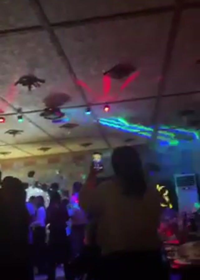 lively party scene, with people dancing and socializing in a room lit by colorful disco lights. A person in the foreground holds up their phone, apparently recording the event. The ceiling is decorated with square panels, and additional light sources are visible, creating a vibrant and energetic atmosphere. The individuals seem to be enjoying themselves amidst the music and colorful lighting.