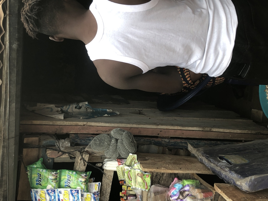 A male subject, viewed from the back, stands at the entrance of a rudimentary market stall in Alor, Nigeria