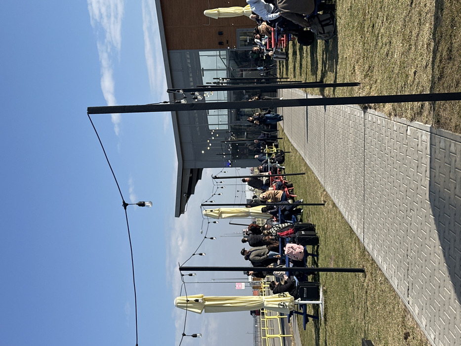 The image displays an outdoor patio area under a clear blue sky on a sunny day at Warsaw Modlin Airport in Nowy Dwór Mazowiecki, Poland