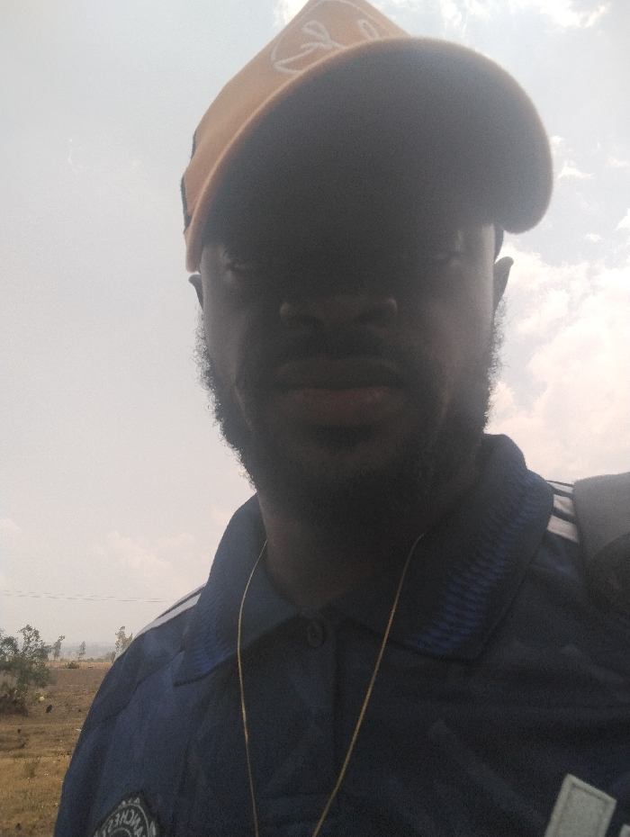 A male individual is depicted in a close-up, upward-angled outdoor shot, consistent with a selfie, taken in Durimi, Nigeria