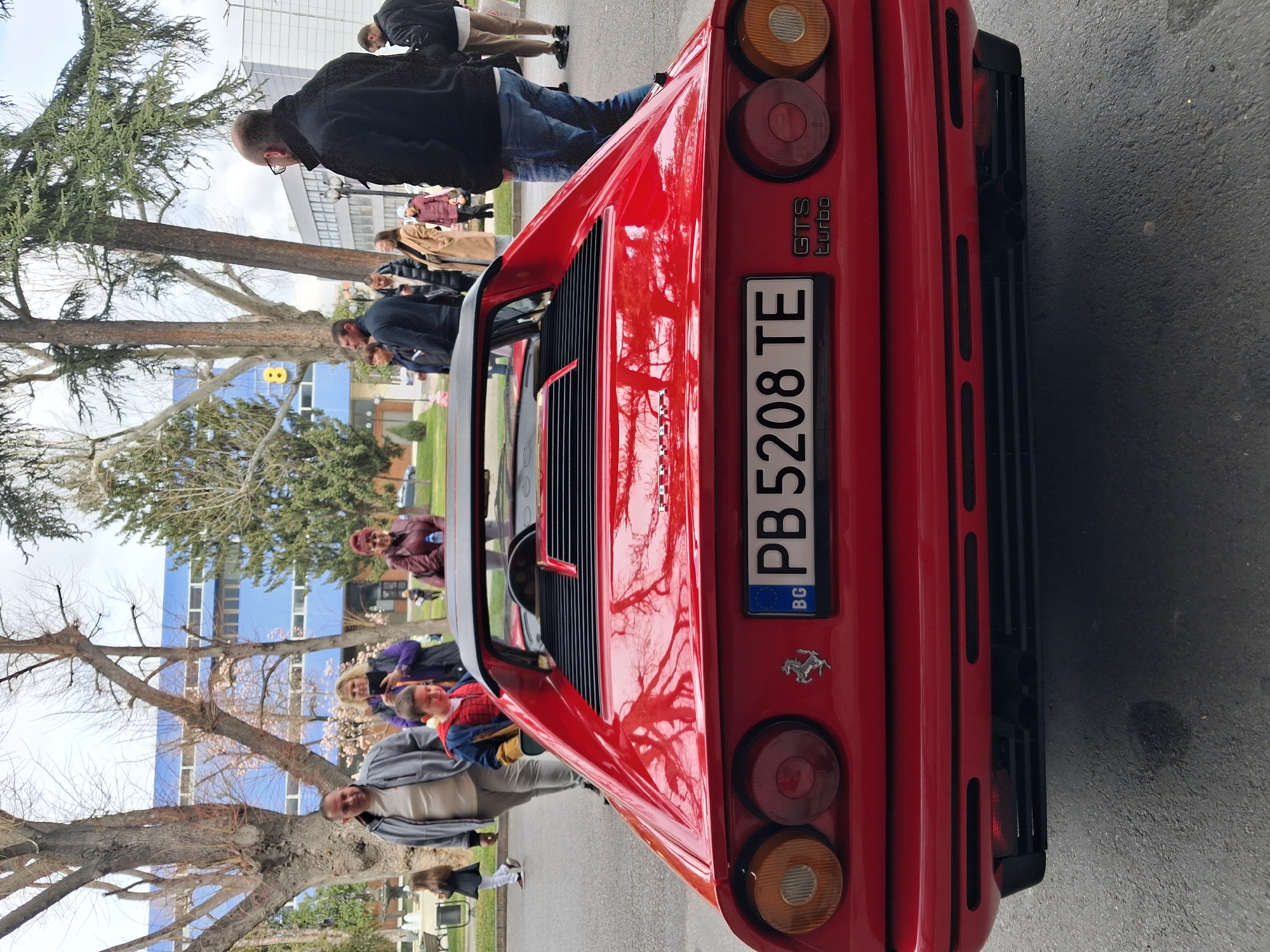 An outdoor, daytime scene captures the rear view of a red classic sports car on an asphalt surface, surrounded by approximately ten individuals. The primary subject is a red Ferrari 308 GTS Turbo, identifiable by its "GTS turbo" badging on the lower right of the rear fascia and the Ferrari prancing horse emblem below the license plate. The vehicle features a black targa top, a louvered engine cover, and circular rear lights (amber turn signals outermost, red brake/tail lights innermost). A Bulgarian license plate, "PB 5208 TE," is mounted centrally, indicating registration in Plovdiv. Dual exhaust pipes are visible at the bottom of the rear bumper assembly. Reflections of bare tree branches are visible on the car's glossy red paint. Several people are present in the scene. On the left, a man in a grey jacket and a young boy in a red and blue Spider-Man-themed jacket are walking towards the car. A woman in a purple jacket is visible behind them, holding a smartphone, seemingly capturing the scene. Another woman in a maroon jacket stands nearby. On the right, a man in a black jacket and blue jeans stands with his back to the camera, observing the vehicle. Additional individuals are scattered throughout the background, either standing or walking. The environment is an urban park or public space with a paved surface. Large deciduous trees with bare branches dominate the mid-ground, interspersed with evergreen trees and a blossoming tree with pink flowers. A park bench and part of a stone fountain are partially visible on the far left. In the background, a prominent multi-story building with a distinctive blue facade and horizontal white window frames is visible. This building's architecture is consistent with institutional structures. The scene is located in the city of Plovdiv, Bulgaria, in an area adjacent to the Medical University of Plovdiv campus, identifiable by the distinctive blue-facade building in the background and the "PB" regional code on the vehicle's license plate. The sky is overcast.