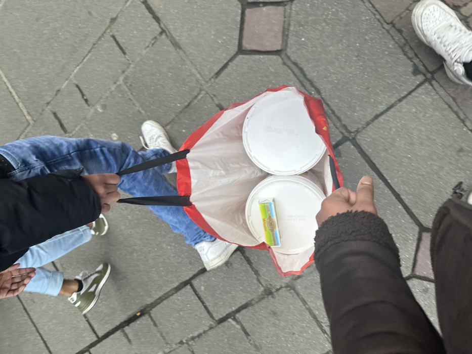 A high-angle shot shows two people carrying a bag. The bag contains two white, round containers and a small, rectangular package, possibly butter or margarine. One person wears blue jeans and light-colored sneakers, while the other wears a dark coat. The background consists of grey brick or pavement. Parts of other people's shoes are visible on either side of the frame. The focus is mainly on the bag and its contents.
