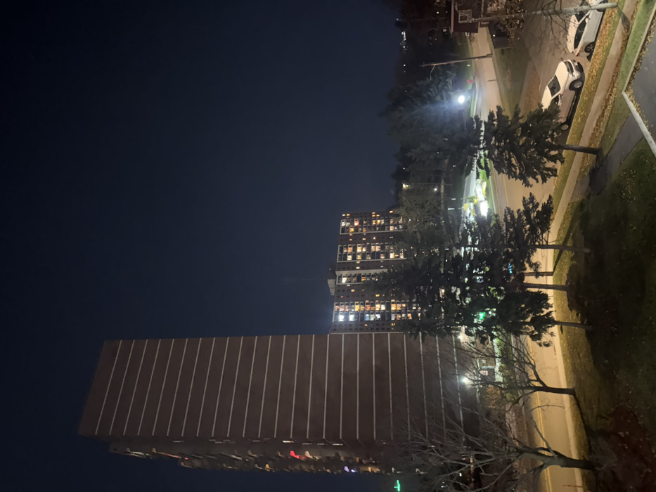 A nighttime view showcases tall buildings illuminated with warm lights, contrasting against the dark sky. Along a street, cars are parked beneath the glow of streetlights. Trees border the road, some still retaining their leaves, creating a textured landscape. The perspective suggests a high vantage point, overlooking the urban scene.