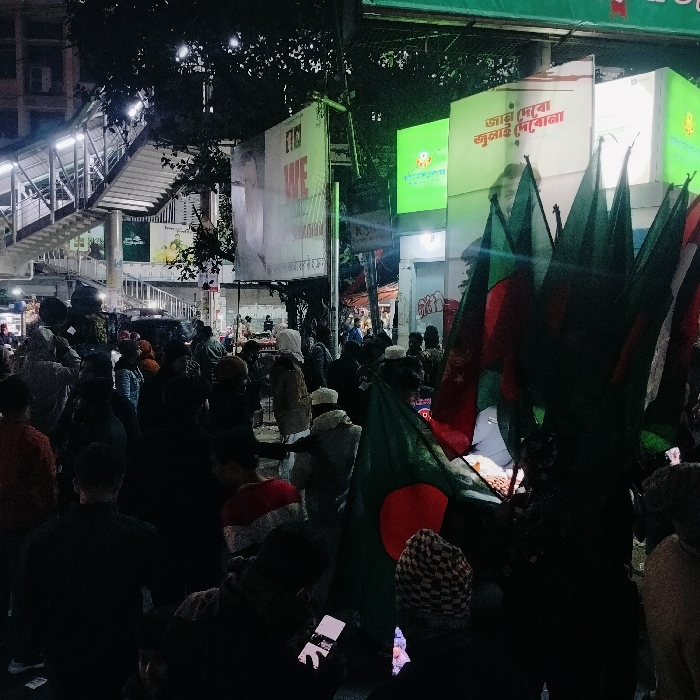 The image depicts a crowded nighttime street scene in Dhaka, Bangladesh