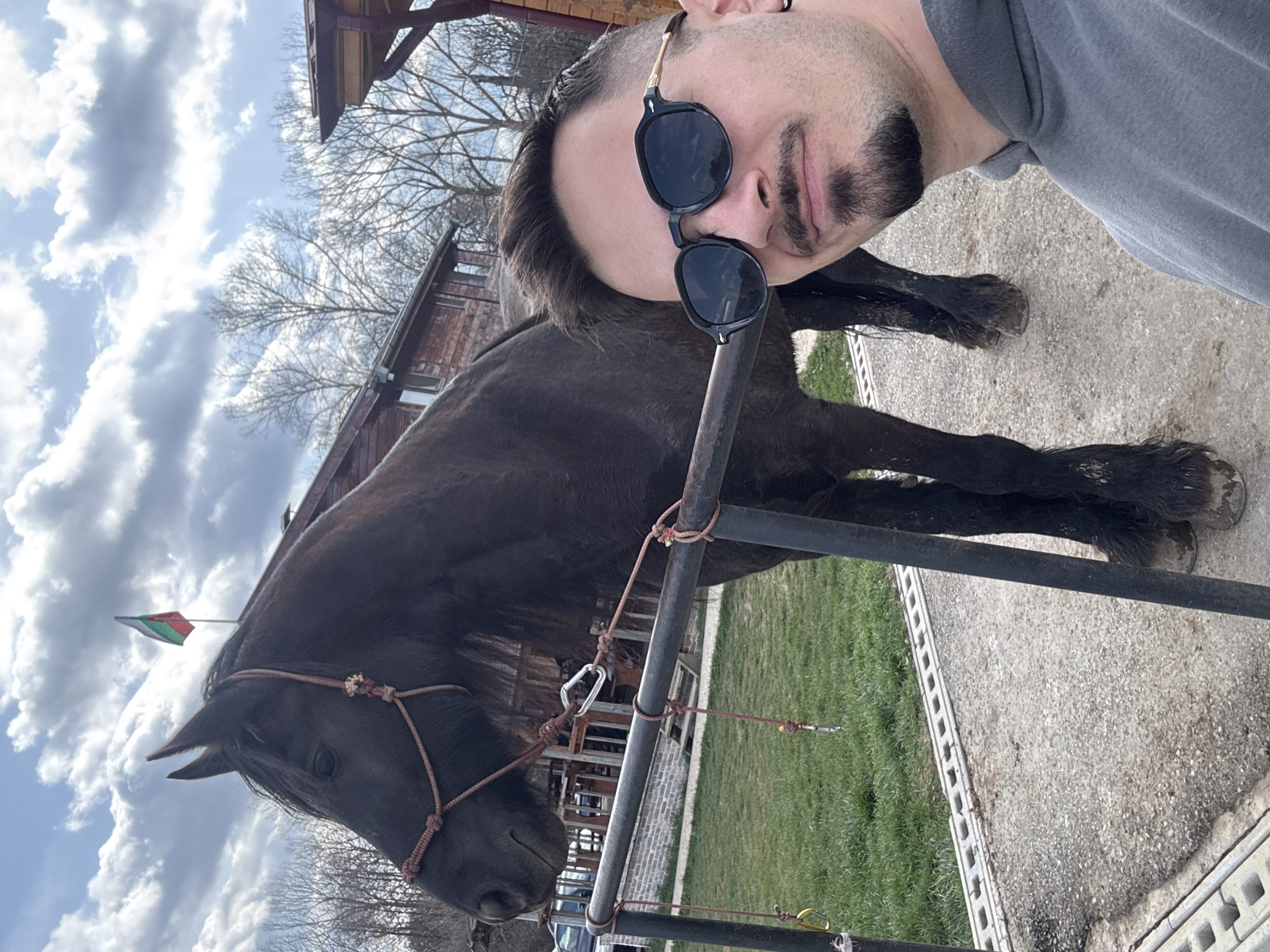 A man with a beard and sunglasses is taking a selfie with a black horse. The horse is wearing a halter and is tied to a metal fence. A small Bulgarian flag is attached to the halter. The setting is outdoors, and the background shows a building and some grass. The location is Kovachevtsi, Bulgaria.