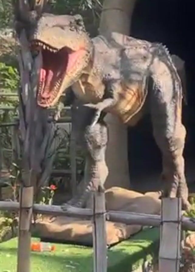 n animatronic Tyrannosaurus rex at what appears to be a dinosaur park or exhibit