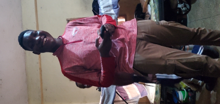 A person with short black hair stands indoors, smiling and holding a black object. They are wearing a red and pink long-sleeved shirt with red trim and brown pants. Behind them, out of focus, are other people and furniture. A light-colored wall with wood trim is visible on the left. The image is oriented with the subject on their side, and appears to be slightly blurry.